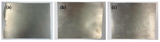 Tungsten plates. (a) A 0.3 ± 0.002 mm (42.5 g/cm3) tungsten plate manufactured via hot rolling; (b) a 0.1 ± 0.001 mm (21.2 g/cm3) tungsten plate manufactured via hot rolling; and (c) a 0.1 ± 0.001 mm (19.1 g/cm3) plate manufactured via cold rolling.