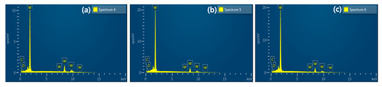 Energy-dispersive X-ray spectroscopy component analysis of tungsten plate. (a) Hot-rolling process for the 0.3 mm plate, (b) hot-rolling process for the 0.1 mm plate, (c) cold-rolling process for the 0.1 mm plate.