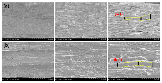 Figure 4 shows the results of the cross-section analysis of the same 0.1 mm-thick tungsten plate using an optical microscope. Figure 4a,b present plates manufactured by hot and cold rolling methods, respectively. No difference was observed in the cross-section during the two processes. However, a comparison between Figure 4(a-1,b-1) reveals a difference in the height between the layers indicated by the yellow dashes, which appeared in the form of a multilayer structure of a thin film during the hot-rolling process. Despite the use of similar multi-layer structures, the structure after hot rolling appeared to be irregular, while the structure after cold rolling appeared to be regular.