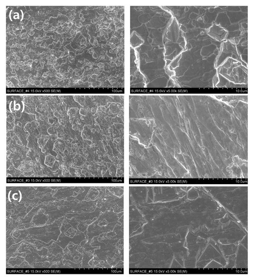 Changes to the surface of the tungsten plate due to the different rolling methods were observed, as shown in Figure 5, and it was found that the surface was slightly denser in the 0.1 mm (21.2 g/cm3) plate that was repeatedly forged to reduce the thickness. The process of increasing the density or adjusting the thickness can directly affect the shielding performance.