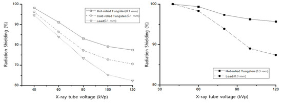 The shielding performance of three tungsten plates was evaluated for each tube voltage. The average value was calculated by irradiating each plate ten times, and the shielding performance of the tungsten plate was compared based on the thickness and processing method for each voltage. These values were then compared with the shielding performance of a lead plate with the same thickness.