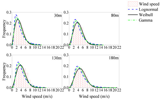Figure 2 shows the fitting effect of different probability distribution models on wind speed distribution at each height. The A–D method is used to test the goodness of fit of each distribution model. It can be seen in the figure that the probability of high wind speed increases with increased height; however, overall, the wind speed is mainly concentrated in low wind speed. As shown in Table 3, this group of samples better obeys the Weibull distribution. Therefore, the subsequent work will use the Weibull distribution to describe wind speed distribution; the Weibull distribution parameters at each height are shown in Table 4.