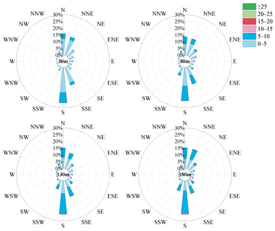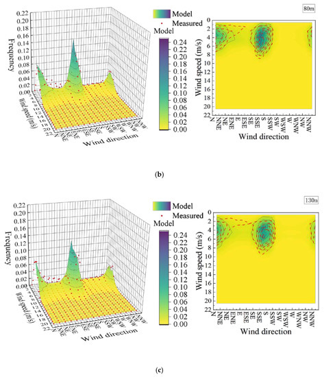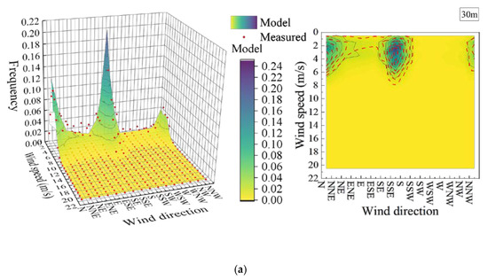 The fitting effect of the AL model is shown in Figure 6a–d. As can be seen in the figure, the probability of main wind direction decreased with an increase in height, due to the influence of the surface. The model prediction results fitted well with the measured data.