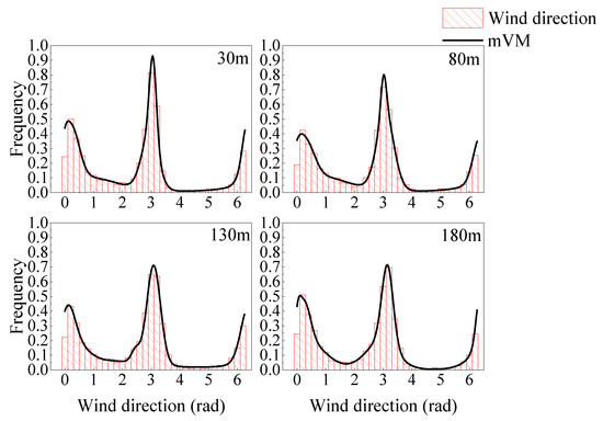 Considering the simplicity of the model as much as possible, while taking into account the overall goodness of fit of the three-dimensional distribution model, this study finally adopted the fifth-order mvM. The wind direction probability density function parameters at each height are shown in Table 6. It can be seen that the fifth-order mvM model has a good fitting effect on wind direction distribution, with an R2 parameter as high as 0.92 or more.