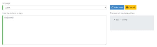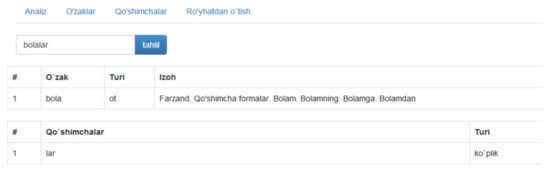 To send a word to the system you need to open the weblink (http://uzmorphoanalyzer.ru/gen-of-words, accessed on 22 September 2021) and type a word you want to analyze; after that, you need to click <Analyze>. The system should show you the result of analyzing quite quickly. The result might consist of a list of morphemes with their definitions and the sent word itself.
