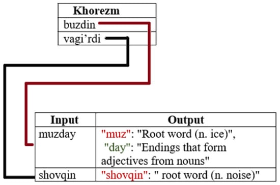 So, assume that a user from the Khorezm region sent a word to the system in order to morphologically analyze it. That user will likely make a mistake during typing a word. For instance, in Khorezm, people say vagi’rdi, which means “noise”, while in the Tashkent dialect (official Uzbek), people would say shovqin. Additionally as an additional example, the word “ice” in the Khorezmian dialect is spoken as buz [bu:z], while in the other two dialects of the Uzbek language, it is spoken as muz. It should be noted that Khorezmian buz in the official Uzbek means “to destroy”. Although Oguz dialect’s vocabulary has some differences compared with the other two dialects, native speakers of all dialects can understand each other by the context of their conversation.