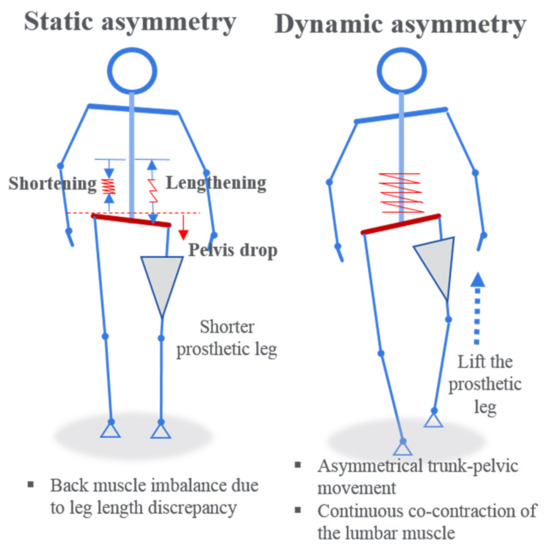 Abnormal lumbar muscle activity is one of the factors affecting the LBP of LLAs. Factors contributing to left-right asymmetry include static asymmetry (i.e., leg length discrepancy, LLD) and dynamic asymmetry (i.e., asymmetrical trunk-pelvic movement) (Figure 1) [4,5,6].
