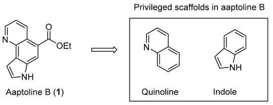 Aaptoline B (1) has been reported as a pyrroloquinoline alkaloid isolated from the marine sponge Aaptos aaptos by a Chinese research group []. Structurally, as shown in Figure 1, 1 is characterized by a unique 7H-pyrrolo [2,3-h]quinoline skeleton embedded with privileged scaffolds, such as indole and quinoline. Indole and quinoline derivatives exhibit diverse biological activities, including anticancer and anti-neurodegenerative diseases. Hence, these two scaffolds, including their heterocycle-linked and fused analogs, have been considered important privileged scaffolds in drug discovery [,,].