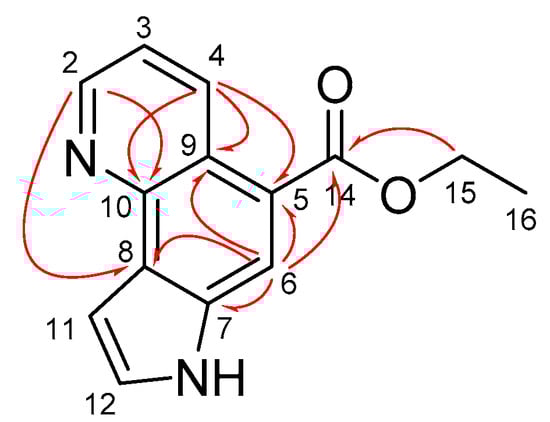 Taking into consideration the previous assignments of 1H-NMR of the indole system [], protons at δ 7.34 and δ 7.59 were assigned as protons on C-11 and C-12, respectively. Furthermore, based on preceding literature in which the peaks observed at about 125 and 145 ppm were designated as C-9 and C-10 carbon adjacent to nitrogen atom, respectively [,,], the peak at δ 144.7 was assigned as carbons at C-10. Through two-dimensional NMR analysis, we were also able to assign the 13C-NMR peak of C-9 (δ 120.8) that could not be assigned in the previous study []. Overall, our assignment of 1 seems to be more reasonable compared to the previous report. The selected HMBC correlations are shown in Figure 3.