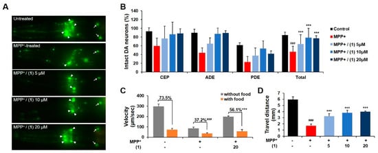 Neuroprotective effects of synthesized 1 on the DA neurodegeneration in the MPP+-exposed C. elegans. (A) GFP fluorescence signals of CEP (arrowhead) and ADE (arrow) in the Pdat-1::GFP nematode were photographed at 400× magnification. (B) The viability of all eight DA neurons was scored by inspecting the GFP expressions of Pdat-1::GFP nematode. (C) The velocity of wild-type nematodes was observed in the presence or absence of food (E. coli OP50) and the basal slowing response was calculated. (D) The travel distance of wild-type nematodes was recorded for 20 s under a dissecting microscope. Statistical significance was determined by one-way ANOVA; ### p < 0.001 compared with vehicle alone; *** p < 0.001 compared with MPP⁺-treated control.