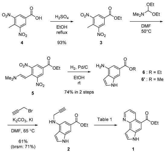 The retrosynthetic analysis for 1 is depicted in Figure 2, which includes the 6-endo selective transition metal-catalyzed cycloisomerization of 4-propargylaminoindole 2. Precursor 2 was expected to be readily synthesized from the known dinitrobenzoate 3 by Batcho–Leimgruber indole synthesis, a powerful synthetic method for the synthesis of indoles from ortho-nitrotoluenes, which proceeds via the formation of the enamine intermediates and subsequent reductive cyclization [], followed by regioselective N-propargylation.