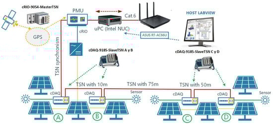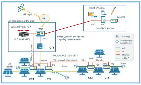 In short, the architecture of the system under evaluation is divided into three operation areas: the area dedicated to irradiance measurements located in strategic positions along the surface of the plant, with connections (4–20 mA) to minimize losses associated with the length of the conductors; the area associated with power quality (PQ) measurements located in each of the CT distribution centres; and the area where the µPMUs that carry out the system synchronisation would be located. TSN synchronism would be essential to guarantee the simultaneous capture of all samples deriving from the four cDAQs. Each cDAQ would capture the samples from the eight pyranometers in its sector and would act as a PQ in each CT sector. The distributed measurements in each 1 MW sector with TSN technology would allow for the aligning of samples, with the quality analysed in the following sections of this work. In addition to the three areas described above, there would be an area dedicated to data collection in a local database. It is an important task to decide which resolution is the most appropriate to store the time series based on the needs of the research. This storage would be done locally at a higher resolution and then would be transmitted to a global database in the cloud.