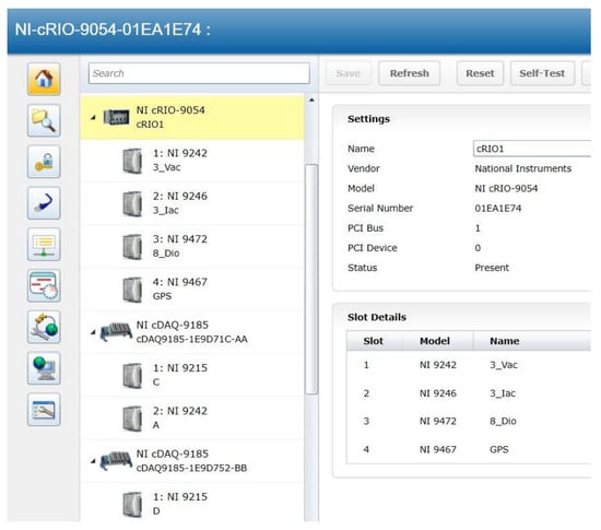 Figure 3 shows the information provided by the cRIO web server. Type-C modules inserted in the cRIO slots for the management of the µPMU can be seen. From the cRIO-9054, it is possible to start the capture process with the Type-C Modules housed in the cDAQ-9185 as well as to process the information. The PLLs of the cDAQs were synchronised as TSN slaves for simultaneous capture. The tests and analyses included in this work are concerned with observing the alignment of the samples with the phase measurements of the waveforms deriving from the channels housed in the four cDAQs under different working conditions. The time series allows the effect on production to be analysed.