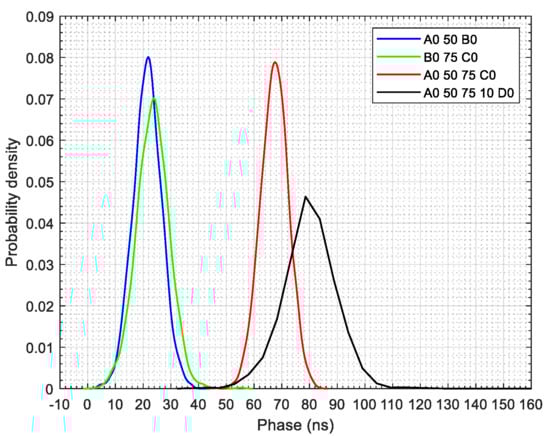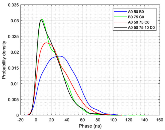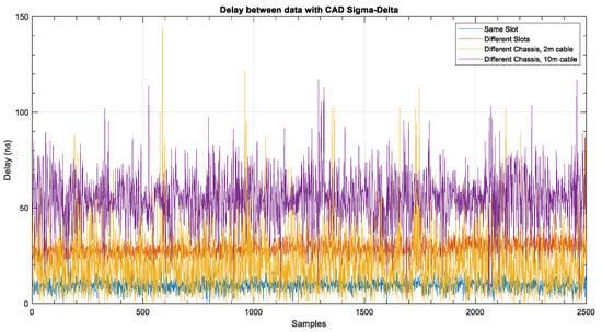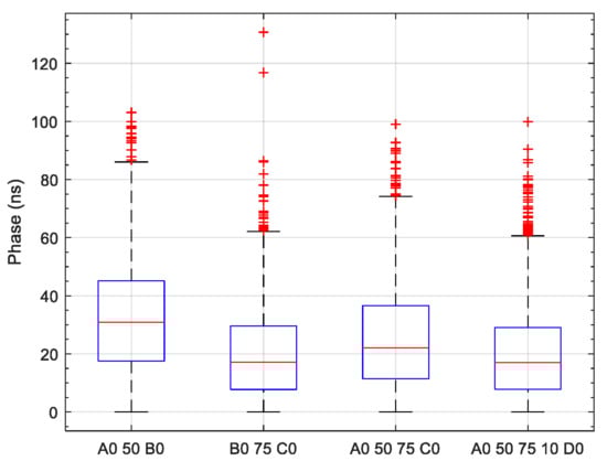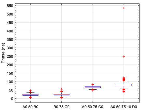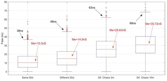 Table 3 shows the statistical results for the four trials. On the one hand, the accuracy was observed with a median of Me = 9.5 ns and a very low variance of σ2 = 7.7 ns for the Sigma-Delta channels integrated into the same module A was seen. When they are in different modules of A and B, the average errors of Me = 28.31 ns and the variance of σ2 = 14.9 ns were obtained.