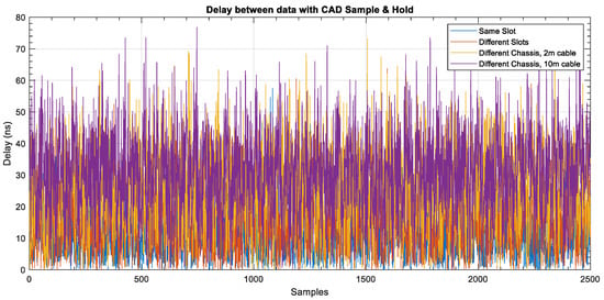Table 4 shows the accuracy of SARs integrated in a module with four channels, which is equivalent to a median of Me = 10.3 ns with a variance of σ2 = 82.3 ns, notably much higher than that of the Sigma-Delta modules. When the channels were in different slots and in modules C and D, average errors of Me = 14.95 ns and a variance of σ2 = 113.71 ns were obtained. The same table shows the responses when capturing with different chassis and Ethernet cable lengths of 2 and 10 m. The medians obtained were of very high quality, with values of 25.63 ns and 30.72 ns, but with a dispersion represented by variances of σ2 = 168.43 ns and σ2 = 185.66 ns. These are very good results with a consistent response depending on the length of the conductors.