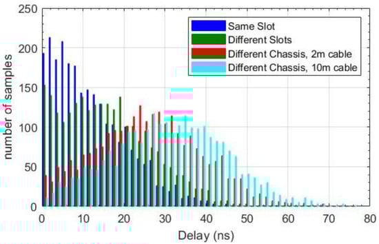 The box plot in Figure 17 shows that the results were below 50 ns for a 95% distribution of the samples with two chassis and with both 50 m and 75 m cabling. These are undoubtedly the highest quality results, guaranteeing an uncertainty of 5%. Conversely, this quality was progressively reduced when three and four chassis were used. In no case did 95% of the samples exceed 110 ns. Figure 18 shows a response with an almost Gaussian distribution for the four tests, with a dispersion level of less than 40 ns for the first three tests and less than 190 ns when using four chassis.