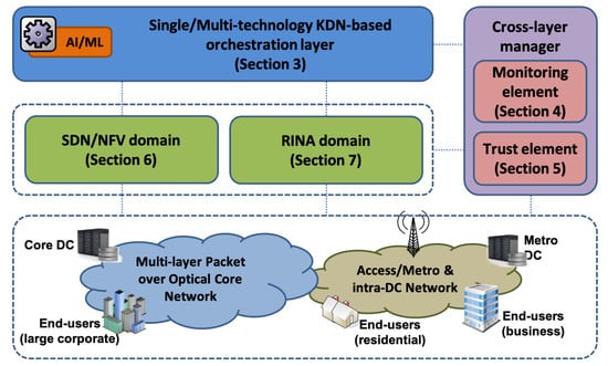 11]—to construct a knowledge-based layer for efficient network orchestration in SDN-based networks. The resulting AI-empowered knowledge plane can be beneficial to efficiently implement emerging networking trends based on complex high-level operational goals, such as Intent-Driven Networking [