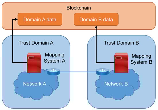 52]. This way, participants can exchange, transfer and split blocks of IP addresses as in a financial blockchain. As we mentioned, this approach does not rely on centralised CAs, and decentralises trust: users do not depend on the actions of the CAs, since each IP prefix is tied to the public–private keypair of the operator. In addition, we can add metadata to each transaction. Since these metadata are included with the blockchain transaction, they are cryptographically verifiable. Two metadata are especially interesting: Autonomous System Numbers (ASN) and IP addresses. In the first case, since we are binding an IP prefix to an ASN, we can use these data to validate BGP messages in the context of interdomain routing security. In other words, we can verify if an IP prefix should be originated by the legitimate ASN, or has been modified along the path. This approach is an alternative to the RPKI [