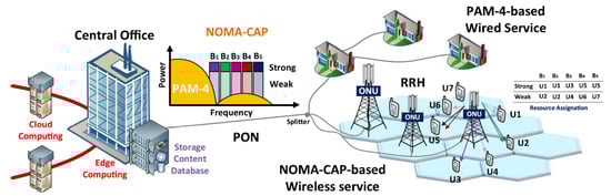 Figure 5 shows the reference scenario for this work where the Pulse Amplitude Modulation 4-level (PAM4) has been used for legacy systems and NOMA-CAP for the future B5G fronthaul. Two NOMA levels (strong and weak) have been considered per each CAP band [