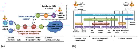 Figure 7b depicts the configuration of DIFs. An Ethernet Shim DIF has been configured over the Ethernet links interconnecting the physical nodes, allowing the use of RINA over this legacy communication technology. On top of these Shim DIFs, a Metro Provider Network (MPN) DIF interconnecting PE routers has been configured, as well as a Service Provider Network (SPN) DIF extending the communication between HRs and the DC BR, a DC Network (DCN) DIF inside the DC, a Home DIF inside the end-user home, and an upper-level Video Streaming Application DIF supporting the delivery of the video streaming sessions to end-users across the VLC VideoLAN Server, the DC BR and the HRs. As VLC VideoLAN is an application that runs over IP, iporinad is required on the video streaming session endpoints, to create IP point to point tunnels over the RINA network.