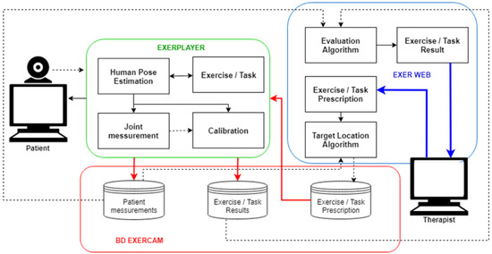 ExerCam is designed as an application for telerehabilitation-based exergames. For this, we make use of the augmented reality mirror-type technology based on 2D body pose detection. The system, as seen in Figure 1, makes use of an RGB camera (for example, webcam type) installed in the patient’s computer. This camera provides the necessary video input to be able to apply techniques of human pose estimation and augmented reality performed in the ExerPlayer module, which allows the gamified scene to be created. ExerPlayer will show the video on the patient’s screen, along with the different virtual elements of augmented reality, the main element being a virtual skeleton superimposed on the patient’s body. Depending on the mode of use (calibration, game or task), other virtual objects (objects to hit, decoration, instructions, user interface, etc.) are also superimposed on the video. All the information about the results of the tasks, exercises and patient data is stored in a database on the cloud, together with the information of the tasks and exercises prescribed by the therapist, which will allow the information to be available and updated in both the ExerPlayer and ExerWeb modules. At the other end of the system is the ExerWeb module, where thanks to its web interface and the different algorithms implemented, the therapist can monitor the patient’s evolution from a distance and set new types of exercises or tasks.