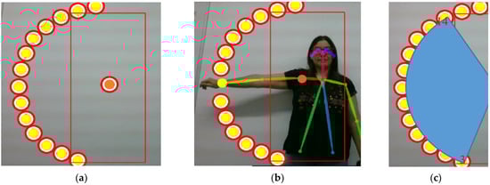 For the example of the left shoulder abduction task, the algorithm TLA takes the patient’s shoulder joint (Center 2) as its central point and shows the shoulder target in the center of the positioning zone (see Figure 4a). For other joints, the target is drawn in other positions. The algorithm calculates the value of the radius r, as shown in Equation (3), where the radius is equal to the distance between the shoulder joints, represented by C(h,k), and the wrist P(h, k). The joints involved in each task are reflected in the Radius column of Table 1.