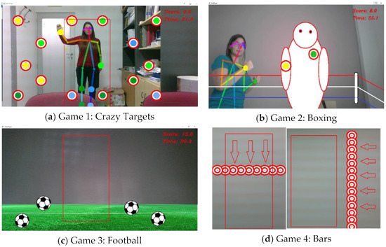 This new methodology makes use of exergames, which allows the patient’s motivation in the realization of telerehabilitation exercises to be increased. Exergames aim to stimulate the mobility of the body through the use of interactive environments with immersive experiences that simulate different sensations of presence and require physical effort to play [4]. Research indicates that they can produce improvements in fitness [5], posture [6], cognitive function [7], balance [8] and other nonphysical effects [9]. The fact that exergames are presented as games and gamify tasks provides the extra potential to increase motivation; therefore, the continuity of exercise or rehabilitation programs by patients. Consequently, diverse exergames have been successfully applied to medical conditions such as stroke [10], autism [11] or motor function impairments [12,13], among many others.