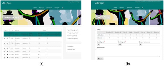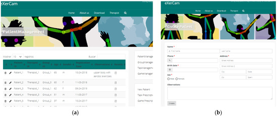 ExerWeb has an ExerCam Patient Management web page. This page is the default page accessed when a therapist enters the website (see Figure 7a). The Patient Management page offers a preview with the most relevant patient data in a table format. This section includes links to create, edit, delete, access the results of tasks and games and prescribe tasks and games to the patient. Both the creation mechanisms and the prescription of tasks are managed through forms (see Figure 7b).