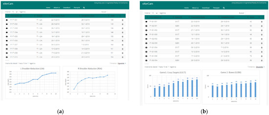 Once exercises are performed by patients, ExerCam provides actionable information to therapists and patients through the detailed results. The result of each game prescribed to a patient should be consulted, as with the tasks, from the Patient Management section (see Figure 9a).