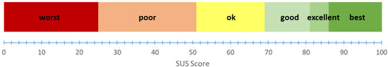 To evaluate the results of the SUS test, we used the adjectives method (see Figure 10). This method is based on the association of the SUS score with an adjective scale (worst, poor, ok, good, excellent, best). In Figure 11, the results obtained from each participant and their average are shown. Acceptable values being considered are those between the adjectives good, excellent or best (that is, with a SUS score greater than 68), indicated by a horizontal red line in Figure 11.