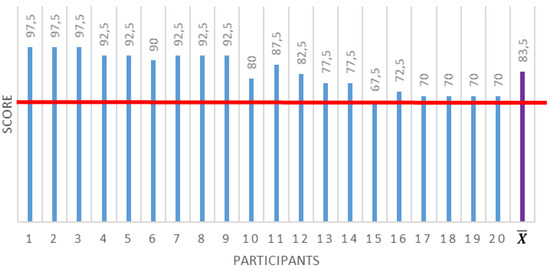 As shown in Figure 11, the total score obtained for each participant was positive, obtaining an average of 83.5 (excellent according to the adjective scale method). This result is significant and provides a level of confidence in the use of ExerCam.