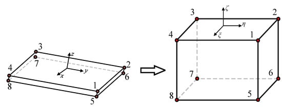 Figure 3 shows the isoparametric transformation of the thin layer element. ξ, η, and ζ are global coordinate symbols, and J is the Jacobian matrix. When the global coordinate system is consistent with the local coordinate system, the following expression is given:
