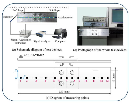 The piezoelectric accelerometers used in this modal test, had a mass of 20 g, charge sensitivity of 6.05 pC/ms2, and frequency range from 0.5 Hz to 5 kHz. The CL–YD–303 hammer had a reference sensitivity of 3.99 pC/N. CRAS V7.0, a vibration and dynamic signal acquisition and analysis system developed by Nanjing AnZheng Software Engineering Company, was used as the analytical instrument, and MaCras was used as the modal analysis software. To simulate free boundary conditions, a spring rope suspension was applied to counteract gravity; this method is effective in avoiding imported errors which affect the dynamic characteristics of the structure. The suspension plane is orthogonal to the test direction to avoid the effect of suspension conditions on the test results. The accelerometer is arranged at the end of the structure to avoid the vibration type node. Thirteen test points are arranged along the length direction of the lapping structure. The sampling frequency is set to 5000 Hz. The arrangement of measuring points is shown in Table 3.