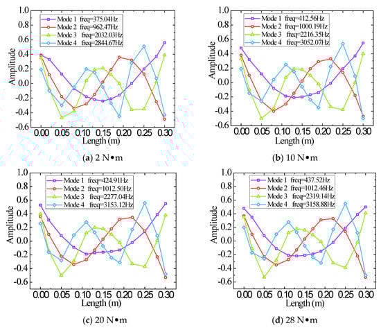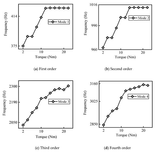 The pre-tightening torque TN = 2, 4, 6, 8, 10, 12, 14, 16, 18, 20, 22, 25, 28 N·m are applied to the bolt through a torque wrench. The first four order modal frequencies under different pre-tightening forces are obtained through multiple modal tests, which are all shown in Table 4. The experimental modal data are plotted and the relationship between the test frequency and the pre-tightening torque is obtained, as shown in Figure 7.