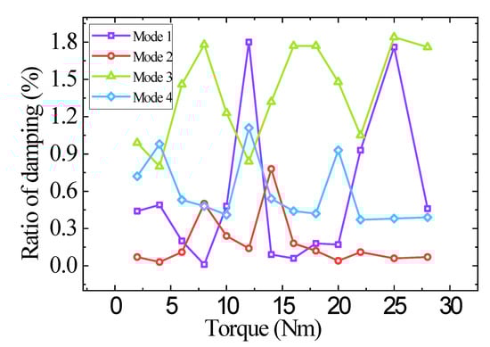 The damping ratio of the bolted connection structure is related to many factors, such as material performance, medium condition, surface roughness, processing method, pre-tightening force state and loading frequency, the influence of which is mostly reflected in nonlinear relations. In addition, the measurement errors will also have an impact on the damping ratio. When measuring the frequency response functions, the measured result of the damping ratio is larger than the actual result due to the effect of accelerometer weighting functions. The first four order damping ratios under different pre-tightening forces were obtained, and are all shown in Table 5. Furthermore, the relationship between the experimental damping ratio and the pre-tightening torque was obtained as is shown in Figure 8.
