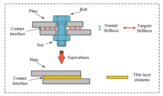 When thin layer elements are used to model bolted structures, the role of bolts on the structure is replaced by thin layer elements established on the contact surface. A schematic diagram of the method is shown in Figure 10.