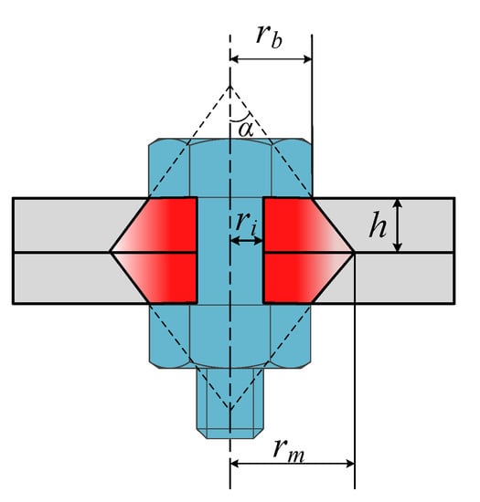 where Fb is the bolt pre-tightening force, ri is the radius of the bolt hole, rm is the maximum contact radius, rb is the radius of the bolt head, and h is the thickness of the connected piece.