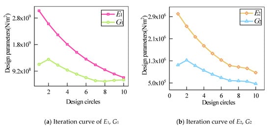 It is important to note the setting of the initial value of the identification parameter. The parameters (E1, G1) of the thin layer element are of the same order of magnitude as the material parameters of the bolt where close to the bolt. However, the parameter selection (E2, G2) is an order of magnitude lower than the material parameters where away from the bolt. The initial value as well as the identification results are listed in Table 6. The iterative convergence curves of the identification parameters are as shown in Figure 14, when the pre-tightening torque is TN = 20 N·m.