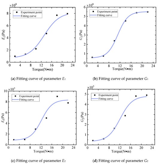 Similarly, the material parameters of the thin layer element under different pre-tightening torque are obtained by the iterative solution method. Finally, the relationship between the identification parameters and the different pre-tightening torque is achieved, as shown in Figure 15.