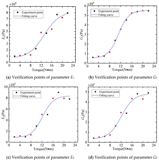 In order to verify the correctness of the method, we selected five points evenly in the interval of the fitting curve, obtained E1, G1, E2 and G2 through the parameter identification method, and put these values into the curve for verification. In Figure 16, the red dots are the verification points. It can be seen that the error between the red dots and the fitting curve is small, which proves the effectiveness of the method.
