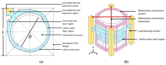 The concept of low-CTE design. (a) Top view of a drafted layer, where L is the original length of the lattice and D is the original diameter of the cylindrical inner part; (b) Isometric view of a unit cell (the two-way arrows indicate the deformation movement of the lattice).