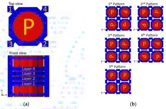 Tessellation of the unit cell in order to construct a lattice structure was then investigated. This posed a challenge because the unit cell was not rotationally symmetric in the XZ plane, resulting in different CTEs in each direction; however, it is desirable to engineer a structure with isotropic planar CTE. In Figure 4, the layers in the unit cell are numbered according to the position of the load-bearing pillar (top view of Figure 4a). Layers 1, 2, 3, and 4 (front view of Figure 4a) are the lowest layer, the second-lowest layer, etc., respectively. The symbol ‘P’ was used to represent the orientation of the unit cell, as shown in Figure 4b. Five potential patterns were selected and created by changing the orientation around the Y-axis and combining them into 2 × 1 × 2 lattices, as shown in Figure 4b. We investigated the 1st pattern to demonstrate the CTEs of a tessellated lattice and the difference between the mean CTEs in the X- and Z-axes of each composed lattice. A 1 × 1 × 1 lattice up to a 4 × 1 × 4 lattice (Figure 5) were chosen for this investigation.