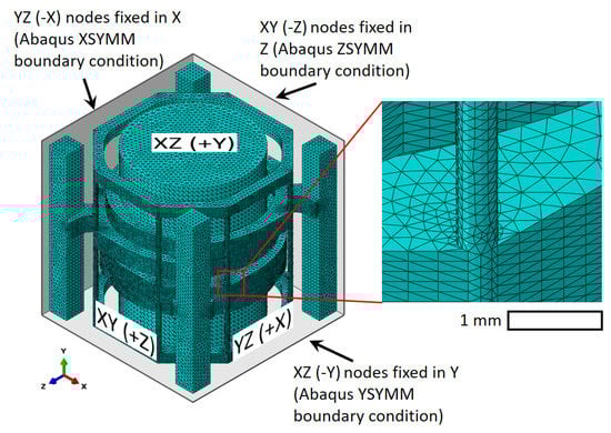 Representative example of the converged mesh of the low-CTE concept lattice unit cell and its boundary conditions applied on a lattice unit cell design.