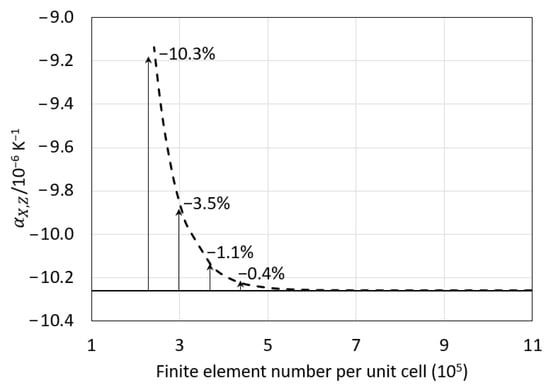 Concept lattice designs were modelled in SolidWorks 2018 to obtain representative CAD models, and their performances were simulated using the FE method implemented in Abaqus 2018 and 2020. The initial lattice unit cell dimensions (i.e., in their un-heated state) were (20 × 20 × 20) mm. The temperature of all elements in all models was raised from 19–23 °C, which represents the temperature variation in a typical temperature-controlled metrology laboratory. All nodes on three of the lattice’s cubic edges were constrained in space, as shown in Figure 6, to enable the calculation of thermally induced expansion. The XSYMM (Symmetry about a plane X = constant (U1 = UR2 = UR3 = 0)), YSYMM (Symmetry about a plane Y = constant (U2 = UR1 = UR3 = 0)), and ZSYMM (Symmetry about a plane Z = constant (U3 = UR1 = UR2 = 0)) boundary conditions were applied to the nodes on the surfaces of the YZ plane in the –X direction (labelled ‘YZ (−X)’ in Figure 6), the XZ plane in the –Y direction (‘XZ (−Y)’), and the XY plane in the –Z direction (‘XY (−Z)’). The thermal expansion of the lattice was calculated by examining the displacement of the nodes on the surfaces opposite to those that were constrained. The in-plane CTE () was found by taking the average of the CTEs in X-axis and Z-axis over four orientations of the unit cell or lattice around the Y-axis: 0° (origin), 90°, 180°, and 270°. In a preliminary investigation, the CTE of a unit cell was calculated using the mesh dependency at different mesh densities to determine the required mesh for accurate CTE modelling. The elements used were ten-node tetrahedral elements (C3D10) because, in comparison with hexagonal elements, they provided a more accurate description of the complex lattice geometry [34,35]. The number of elements per unit cell was increased from 200,000 to 1,100,000 as shown in Figure 7. A mesh density of 440,000 elements per unit cell was sufficient to determine the CTE of the lattice with a deviation of less than −0.4% from the 1,100,000 element result, indicating the result is well converged. Figure 6 shows the unit cell model meshed with 440,000 elements.