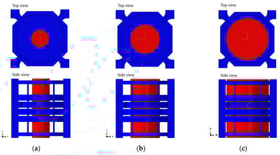 Based on the relationship of the cylindrical inner part and the lattice outer part using parametric constraints, when the size of the cylindrical inner part is increased, the internal geometry of the outer part must increase to maintain physical contact. This leads to varying quantities of material in each part, as shown in Figure 11. In turn, this will affect the manufacturing cost of the lattice structure, since AM processes are relatively costly, especially LPBF [7]. It is clear that the cost can be reduced by designing the lattice to have a ratio of as large as possible in this structure; however, for a target CTE of zero, this places restrictions on the CTEs of the selecting materials.