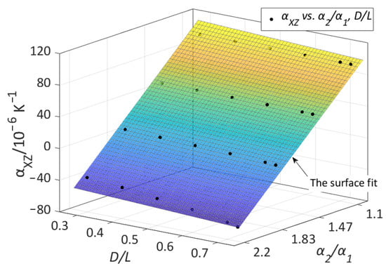 Figure 9 shows that the concept lattice unit cell provides in-plane CTEs () from approximately −62 × 10−6 K−1 to 96 × 10−6 K−1 by varying the design parameters. data were fitted with a first order polynomial surface function of the form