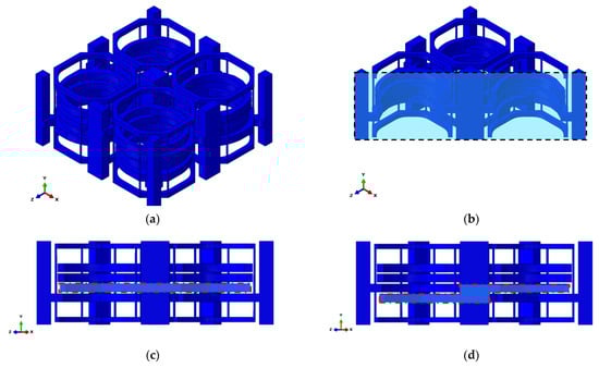 The four CTE-minimising layers had different orientations around the Y-axis: 0°, 90°, 180°, and 270°, as illustrated in Figure 3b. The layers formed two pairs, according to their connectivity with the load-bearing pillars along the cell’s edges. The two layers connected to diagonally-opposite pillars were connected by the struts of the octagonal prism discussed above.