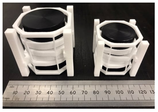 In future, the design will be fabricated using metal to prevent distortions of the frame due to the weight of workpieces and precision measurement equipment [6]. Moreover, the lattice needs to be tested in a physical experiment before being implemented in a real application. Figure 12 shows examples of the optimised design specimens in (40 × 40 × 40) mm and (50 × 50 × 50) mm. The lattice outer parts composed of Nylon 12 were fabricated using an EOS Formiga P100 PBF machine. Cylindrical inner parts composed of UHMWPE were manufactured and resized by conventional manufacturing processes.