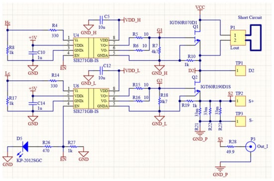 The circuit consists of two GaN devices (Q1, Q2) connected in a single-leg inverter configuration. The two isolated drivers (U4, U6) allow separate switching of the two devices through the Hc and Lc signals generated by an FPGA-based control circuit. The printed circuit board was designed to minimise parasitic inductance in the power stage and gate branches to minimise drain overvoltages and gate oscillations triggered by very fast transients. The stray inductance of the drain path measured with a vector network analyser was 8 ns. With the same instrument, we also measured the stray inductance of resistive shunt that was about 3 nH. The output current was measured as the voltage drop across a shunt resistance RSH = 11 mΩ obtained as the parallel of three 33 mΩ resistors. This voltage is fed to the input of oscilloscope through the resistor R28 = 50 Ω, used to match the output impedance of the circuit with the input impedance of the cable and oscilloscope.