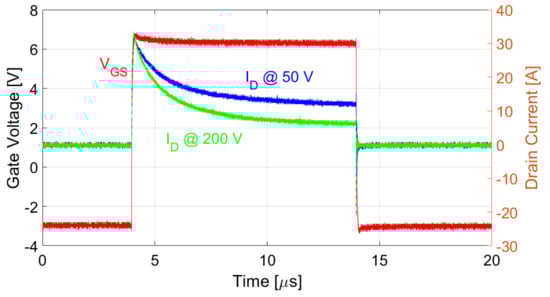 Figure 2 shows the typical waveforms of gate voltage and drain currents obtained during a 10 µs short circuit test. The tested device was a commercially available 7.5 A–650 V GaN Power HEMTs. The test conditions refer to two voltage values VCC = 50 V and 200 V and VGS = 6 V.